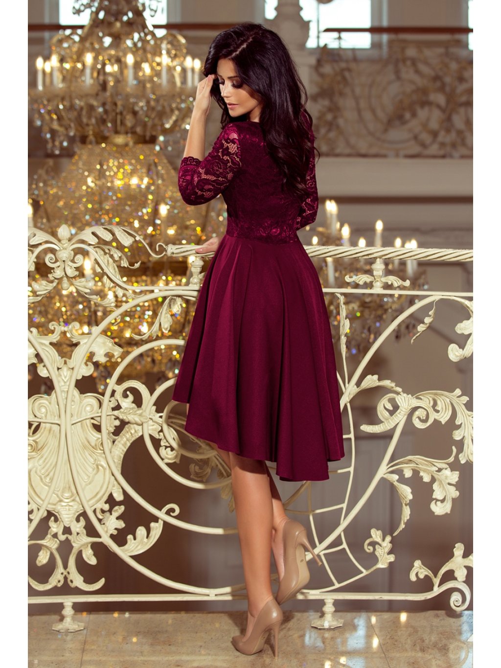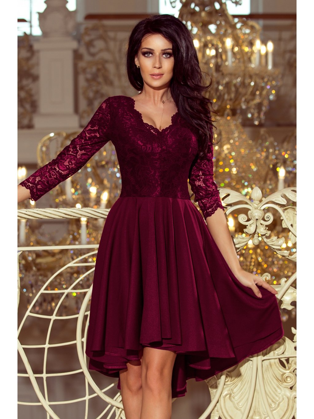 Asymetrické exkluzivní šaty s delšími zády, 3/4 rukávy, výstřihem a krajkou ve švestkové barvě. Sukně s delším zadním dílem bude ideální pro tanec. Vyrobeno v Polsku. Značka Numoco.