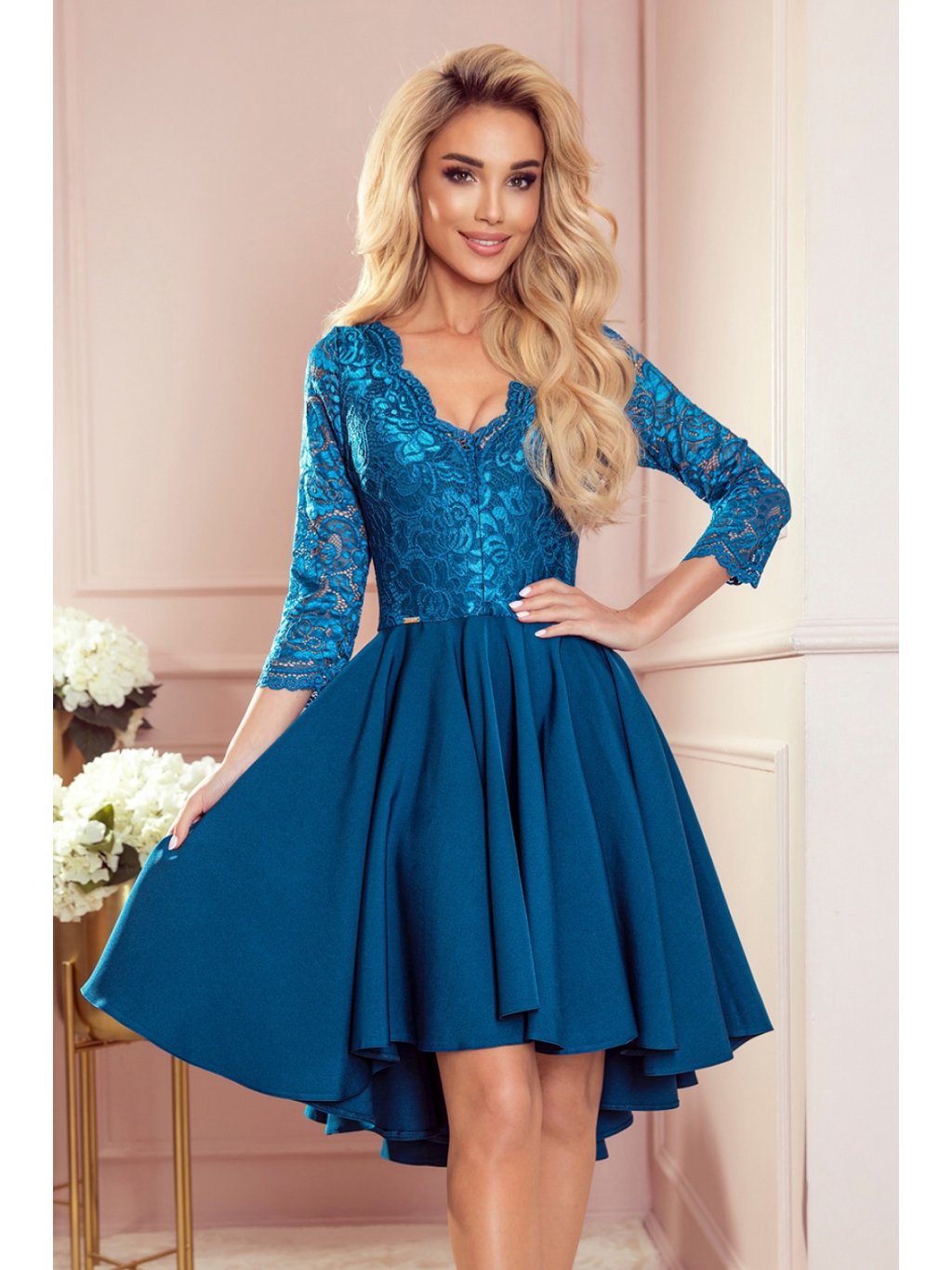 Asymetrické exkluzivní šaty s delšími zády, 3/4 rukávy, výstřihem a krajkou. Šaty v mořské barvě. Sukně s delšími zády bude ideální pro tanec. Vyrobeno v Polsku. Značka Numoco.