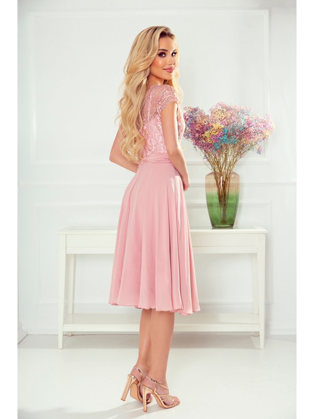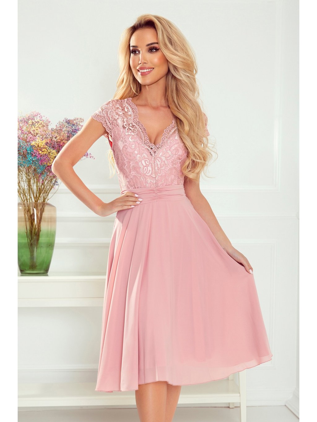 Exkluzivní šifonové šaty s krátkými rukávy, krajkovým výstřihem a výřezem na zádech. Šaty v barvě špinavě růžové. Polská produkce. Značka Numoco.