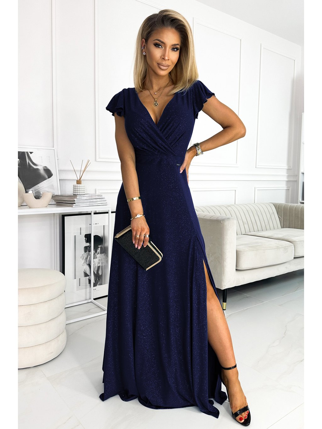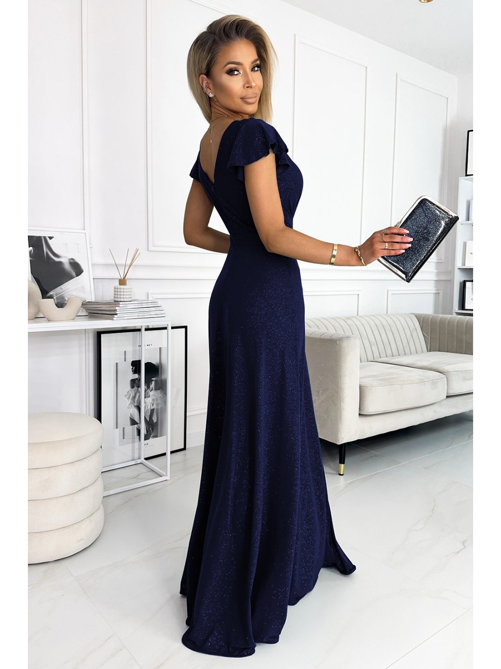 Dlouhé třpytivé maxi šaty s obálkovým výstřihem a rozparkem na nohou. Šaty v tmavě modré barvě se třpytkami. Šaty krásně odhalují výstřih a perfektně se hodí k tanci. Zapínají se na zádech na krytý zip. Polský výrobek. Značka numoco.