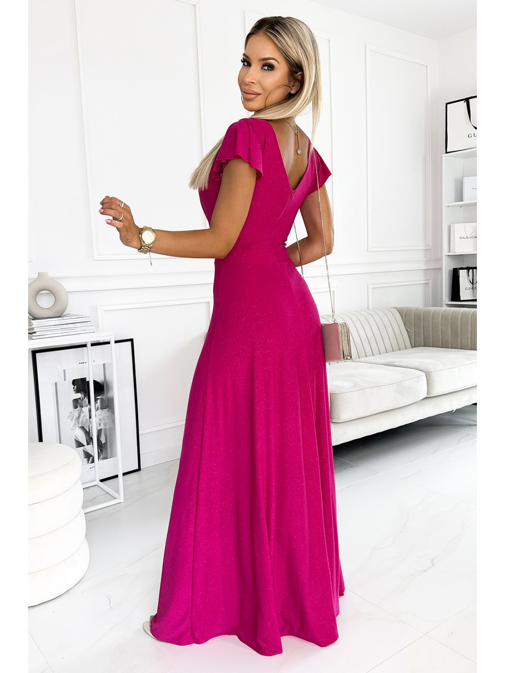Dlouhé třpytivé maxi šaty s obálkovým výstřihem a rozparkem na nohou. Šaty ve fuchsiové barvě se třpytkami. Šaty krásně odhalují výstřih a jsou skvělé na tanec. Zapínají se na zádech na krytý zip. Polský výrobek. Značka numoco.