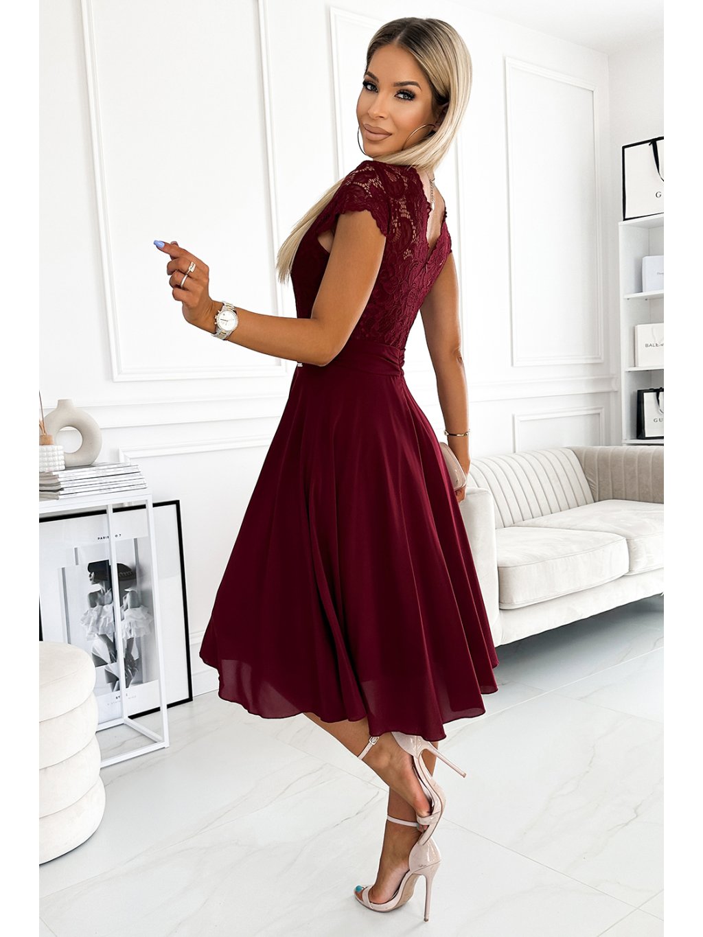 Exkluzivní šifonové šaty s krátkými rukávy, krajkovým výstřihem a výřezem na zádech. Šaty ve vínové barvě. Polská výroba. Značka Numoco.