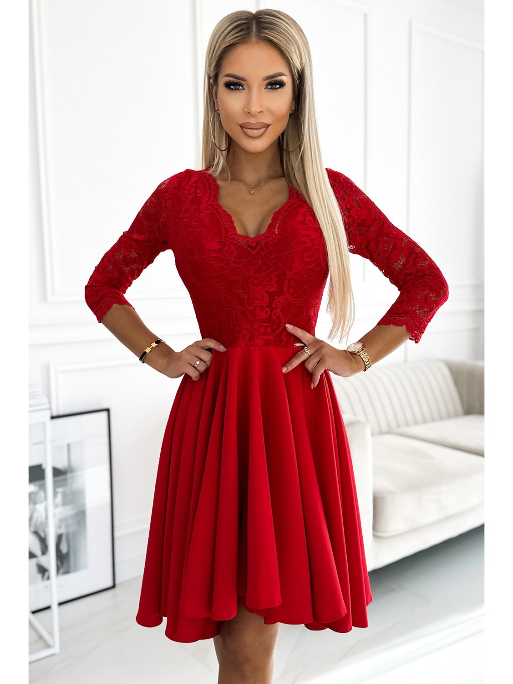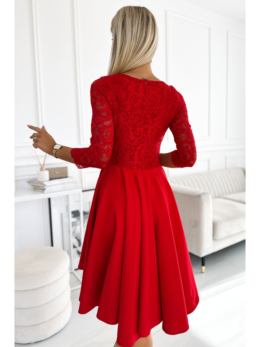 Exkluzivní červené asymetrické šaty s delšími zády, rukávy, výstřihem a krajkou. Sukně s delším zadním dílem se bude skvěle hodit k tanci. Značka numoco. Polská výroba.