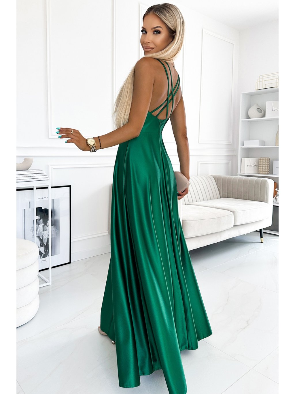 Elegantní maxi dlouhé saténové šaty s rozparkem na nohou, velkým výstřihem a překříženými ramínky na zádech. Jsou vyrobeny z lesklého, hladkého, mírně elastického saténu v zelené barvě. Šaty ideální na svatbu, Silvestra, ples, karneval a jiné významnější události. Vyrobeno v Polsku. Značka Numoco.