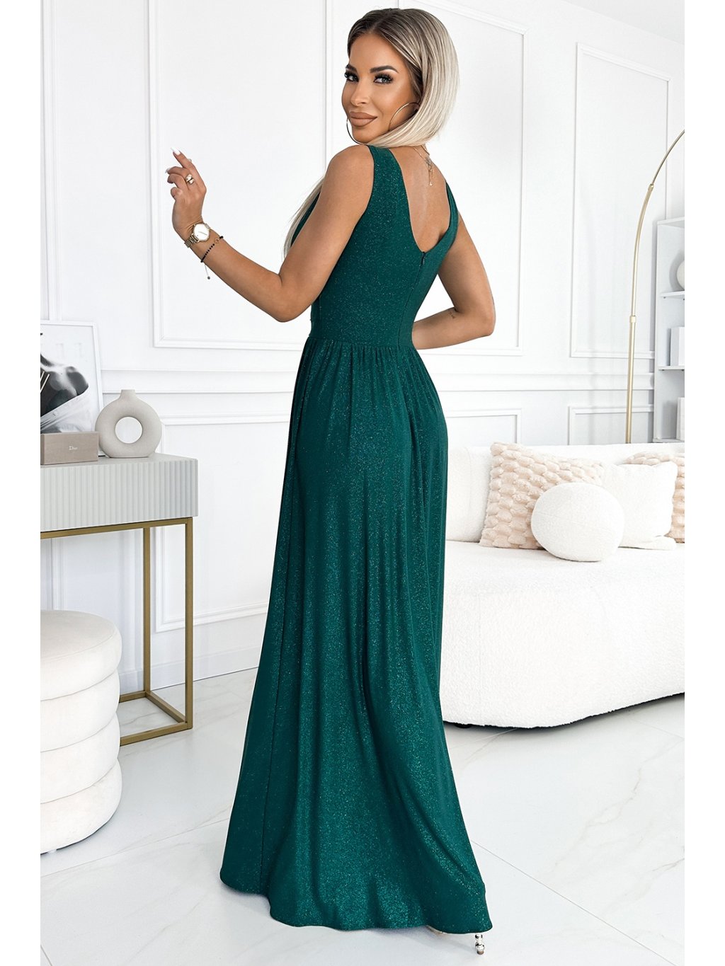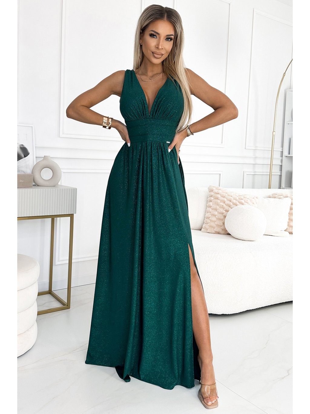 Dlouhé šaty s výstřihem, rozparkem na nohavicích a třemi stehy v pase. Vyrobeno z elastické látky s brokátem v zelené barvě. Ideální na svatby, křtiny a jiné významnější události. Polský výrobek. Značka numoco.