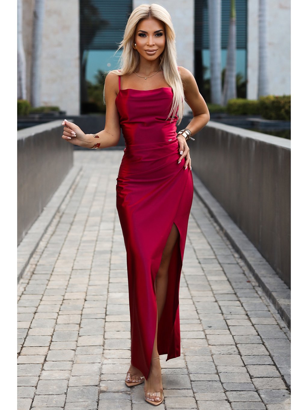 Dlouhé saténové šaty s rozparkem na nohou a řasením na boku. Šaty jsou v malinové barvě. Šaty krásně zdůrazňují pas. Zapínají se vzadu na krytý zip. Polský výrobek. Značka numoco.