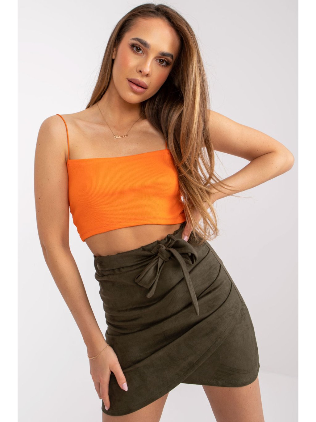 Krátká sukně s asymetrickou přední částí, doplněná páskem na zavazování.