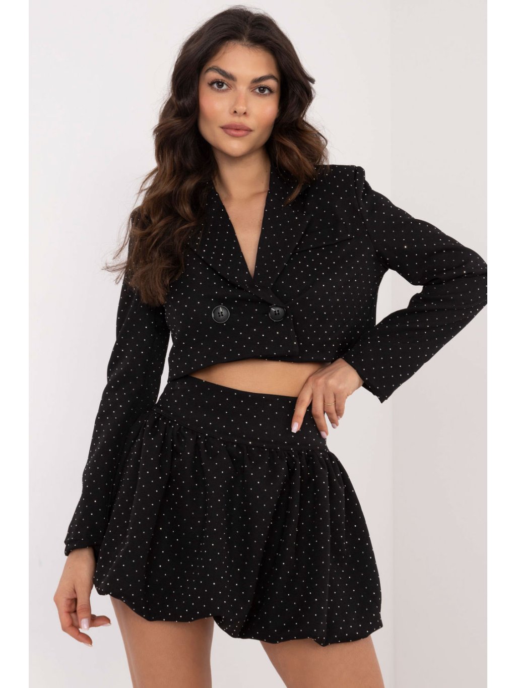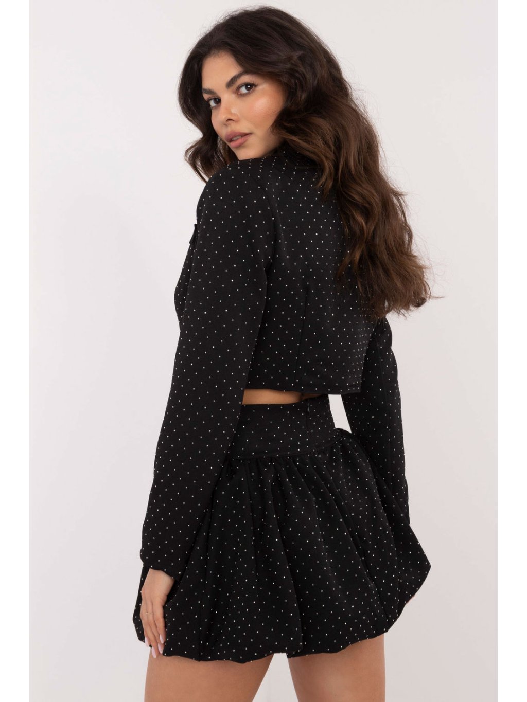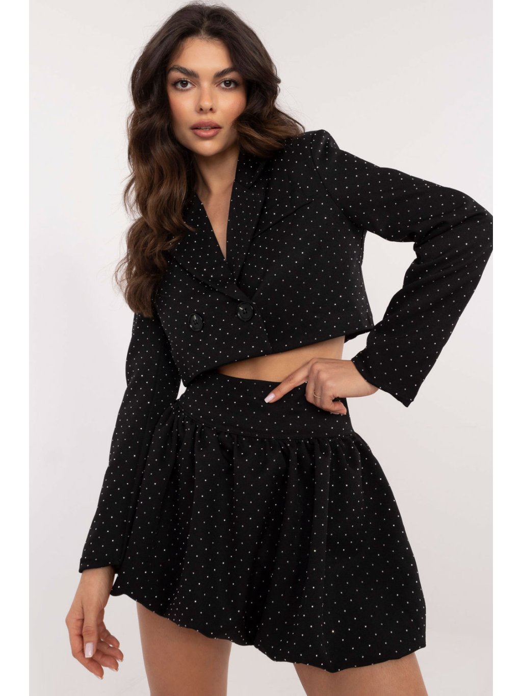 Elegantní mini sukně baňka, ideální na návštěvy a večírky. Vyrobená z kombinace polyesteru a elastanu, poskytuje pohodlí při nošení, odolnost a skvělé přizpůsobení postavě. Elegantní střih zdůrazňují jemné volány, které jí dodávají lehkost a ženský charakter. Na celém povrchu materiálu jsou stylové flitry, které sukně dodávají výrazný, lesklý vzhled. Sukně má podšívku, která zajišťuje pohodlí nošení a krásné uspořádání materiálu. Zapínání na zip umístěné vzadu umožňuje snadné oblékání a pohodlné přizpůsobení. Je to skvělá volba pro ženy, které oceňují eleganci s nádechem moderního stylu. Skvěle ladí s elegantní blůzou a lodičkami, vytvářející jedinečný outfit na speciální příležitosti.