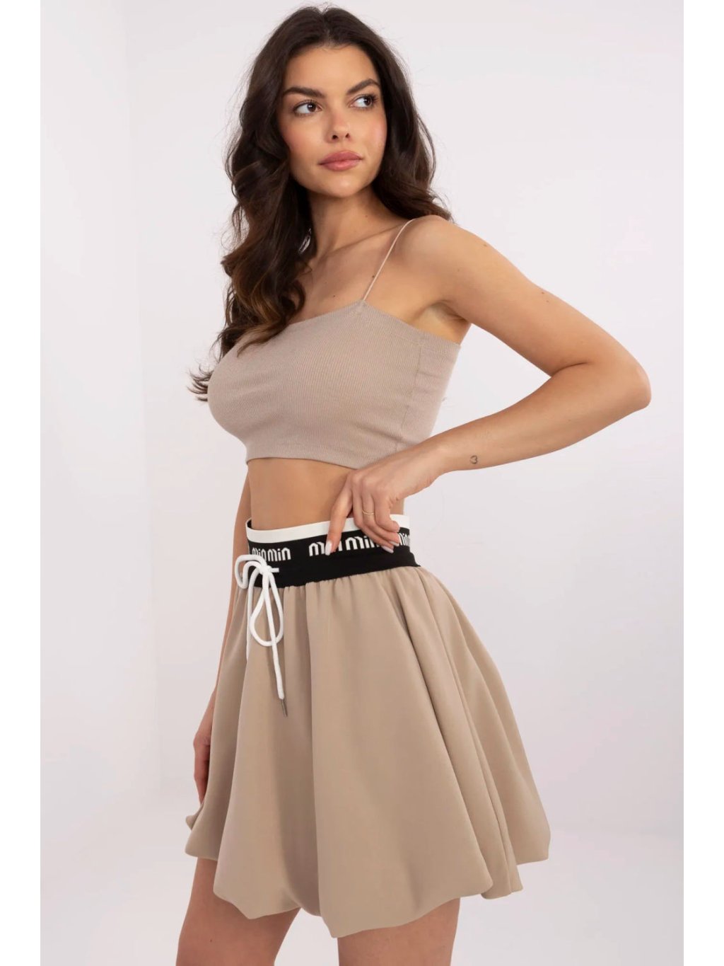 Elegantní mini sukně typu bombka, ideální na každodenní outfit. Vyrobená z kombinace polyesteru a elastanu, poskytuje pohodlí a skvělé přizpůsobení postavě. Hladký materiál jí dodává univerzální charakter, díky čemuž ji lze snadno kombinovat s různými kousky oblečení. V pasu má dekorativní vázání, které dodává šarm a umožňuje upravit přizpůsobení. Sukně má podšívku, co zajišťuje další pohodlí a estetický vzhled. Skvělá volba na každodenní nošení, spojující pohodlí s moderním střihem.