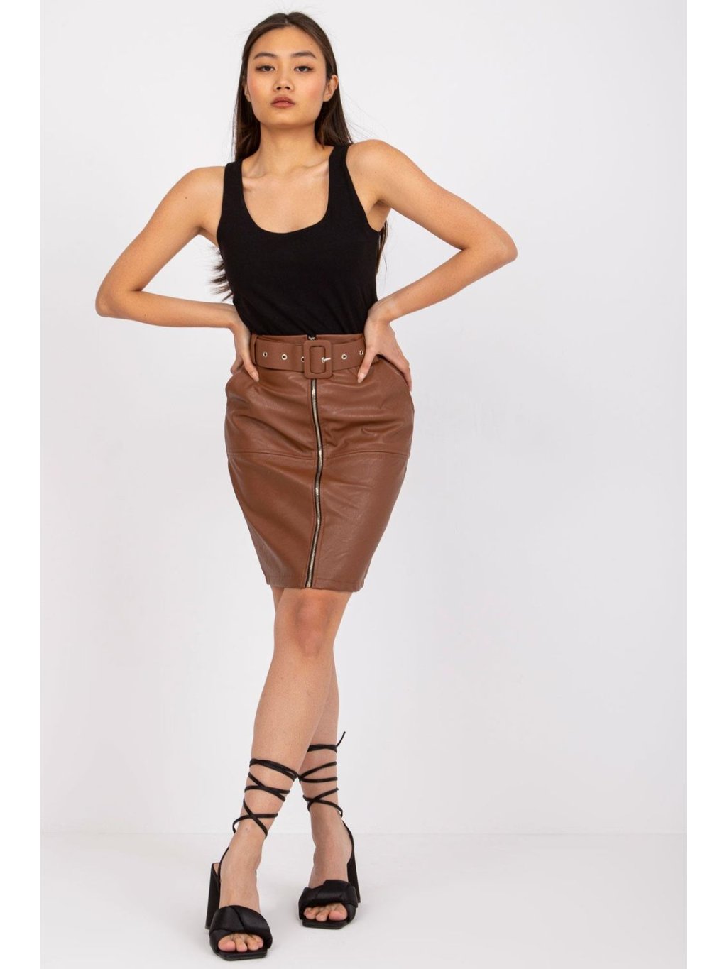 Tužková sukně z ekologické kůže se zapínáním na zip. Na bocích jsou násuvné kapsy a stejnobarevný pásek.
