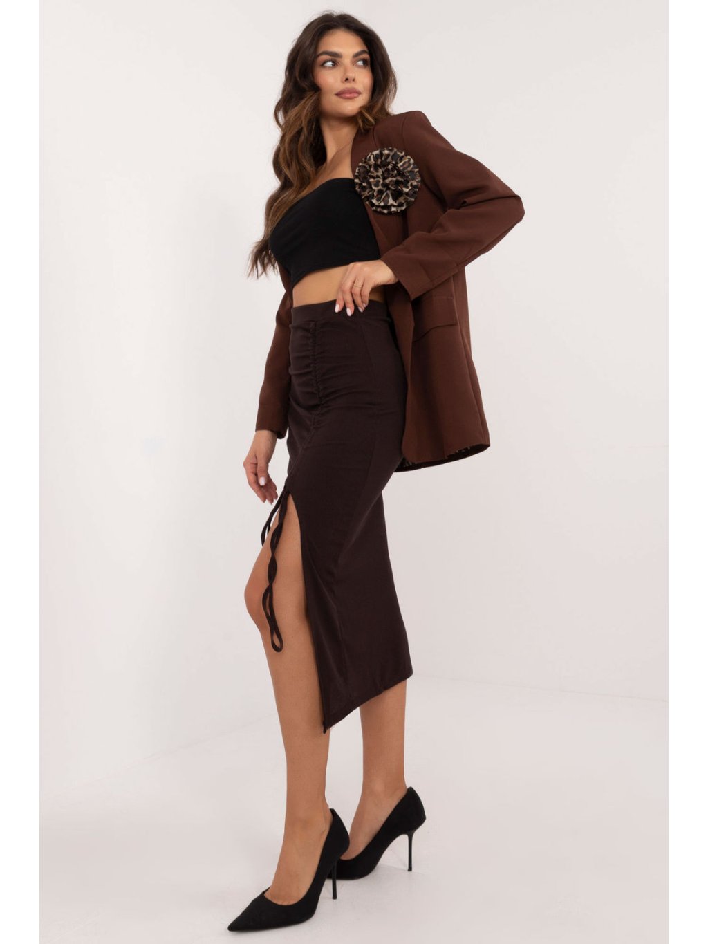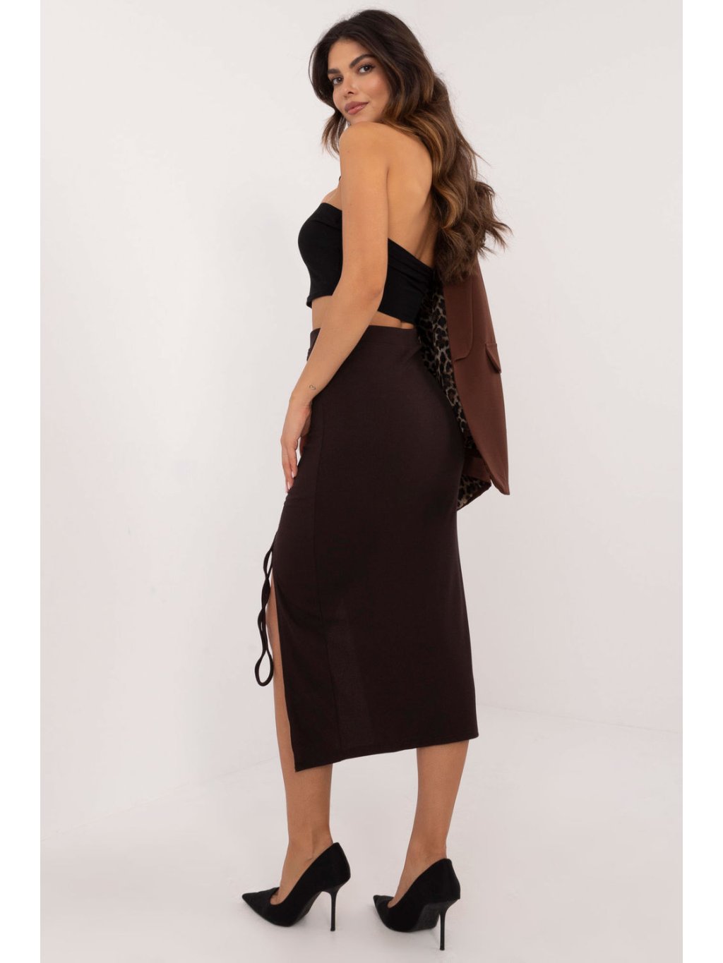 Tužková midi sukně z žebrovaného materiálu, ideální pro každodenní vycházky a neformální události. Je vyrobena z vysoce kvalitního polyesteru a dokonale se přizpůsobí siluetě, takže působí pohodlně a elegantně. Hladký vzor podtrhuje její všestrannost, zatímco řasení vpředu s nastavitelným rozparkem jí dodává charakter a ženský šarm. Díky absenci zapínání se sukně pohodlně nosí a snadno obléká. Je ideální volbou pro ženy, které ocení módní vzhled a zároveň si zachovají pohodlí pro každodenní nošení i na různé události.