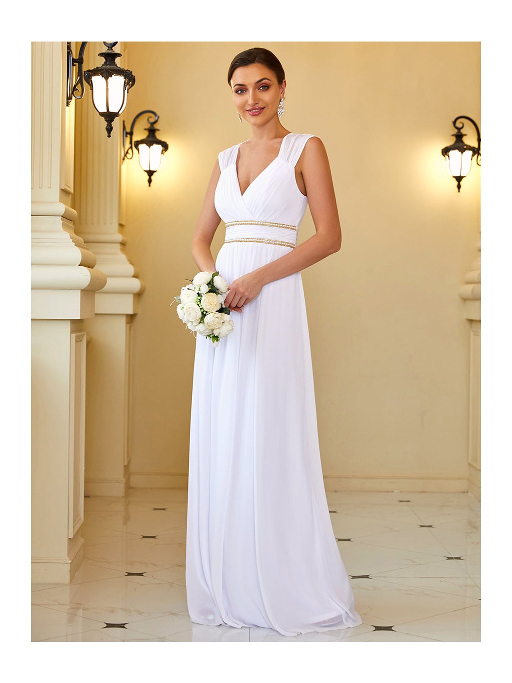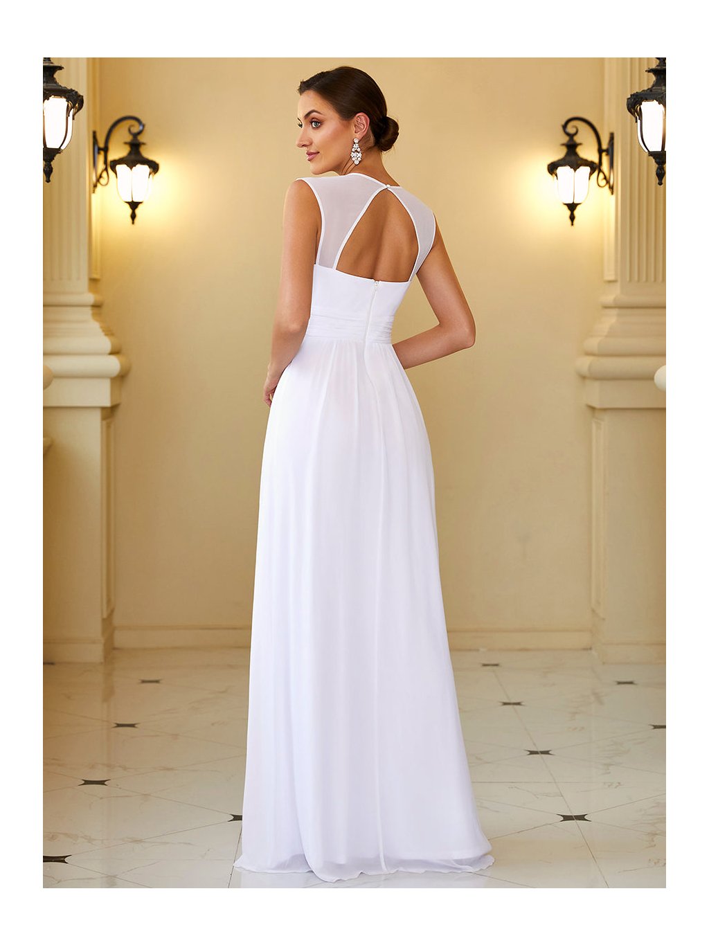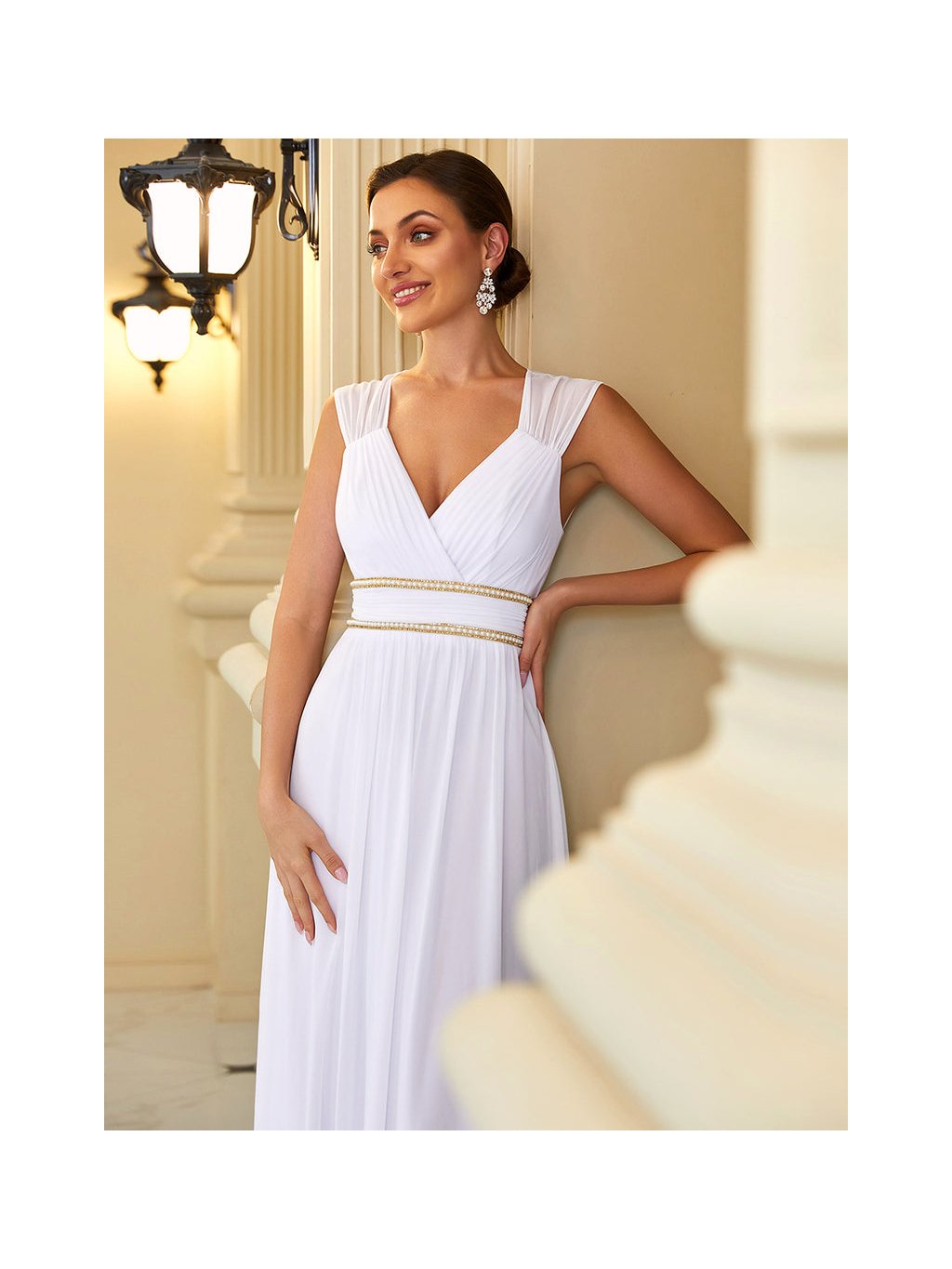 Bílé šifónové šaty s véčkovým výstřihem. Pod prsy jsou dva pásy s kamínky. Vzadu zajímavě vystřižené záda. Zapínání na zip na zádech. Saténová spodnička.