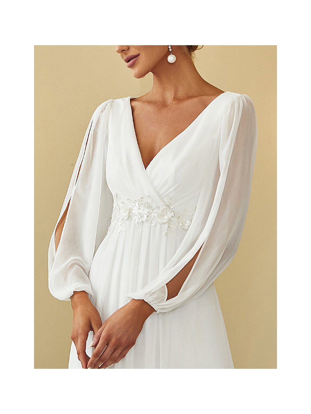Luxusní svatební šaty. Vhodné i do tanečních. Šaty jsou krásného střihu s rukávy, bohatě zdobené flitry ve tvaru lístků. Ve předu mají véčkový výstřih. Šatičky mají skrytý zip na zádech.