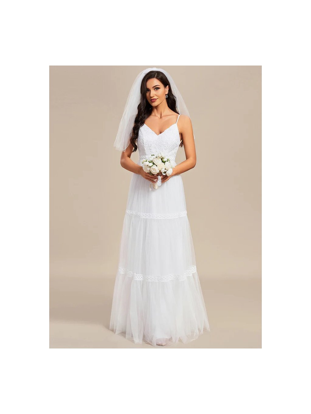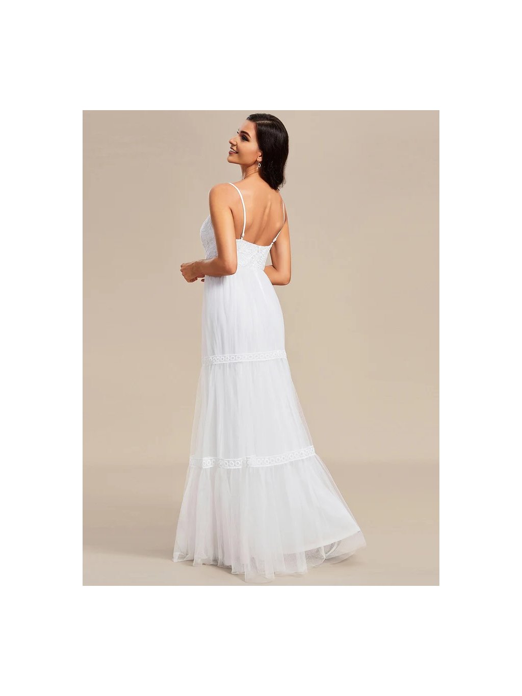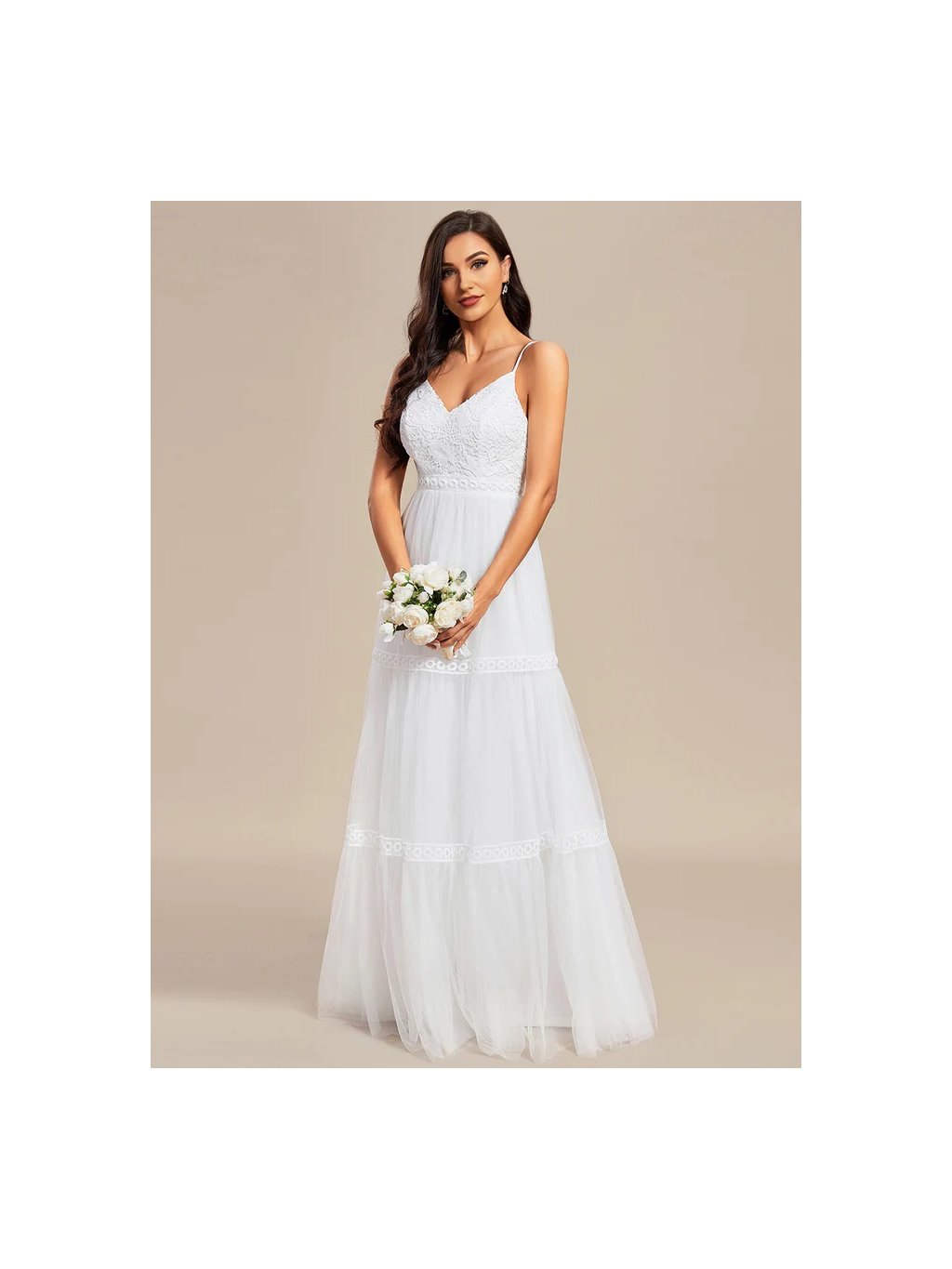 Úchvatné svatební šaty Ever Pretty. Šaty jsou bez rukávů, jen na špagetová ramínka. Na prsou velký výstřih.