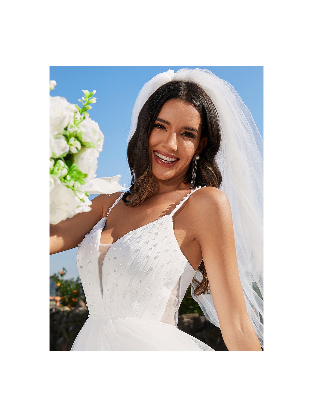 Úchvatné svatební šaty Ever Pretty. Šaty mají krajkovaný top s krátkými rukávy. Šaty zdobené perličkami.