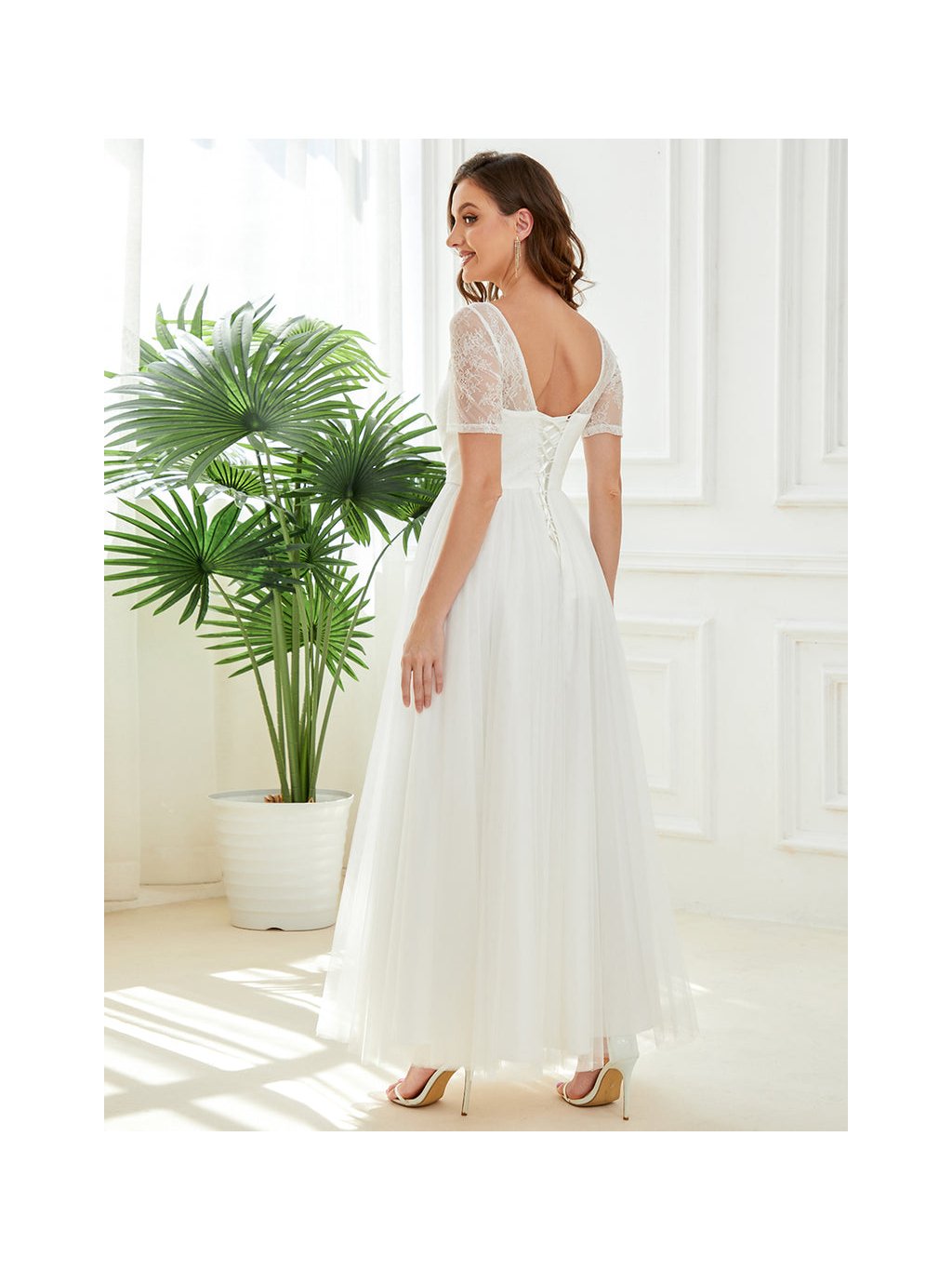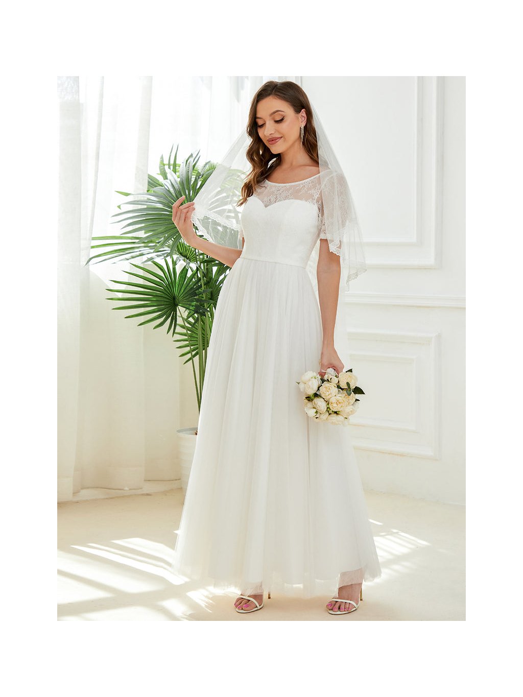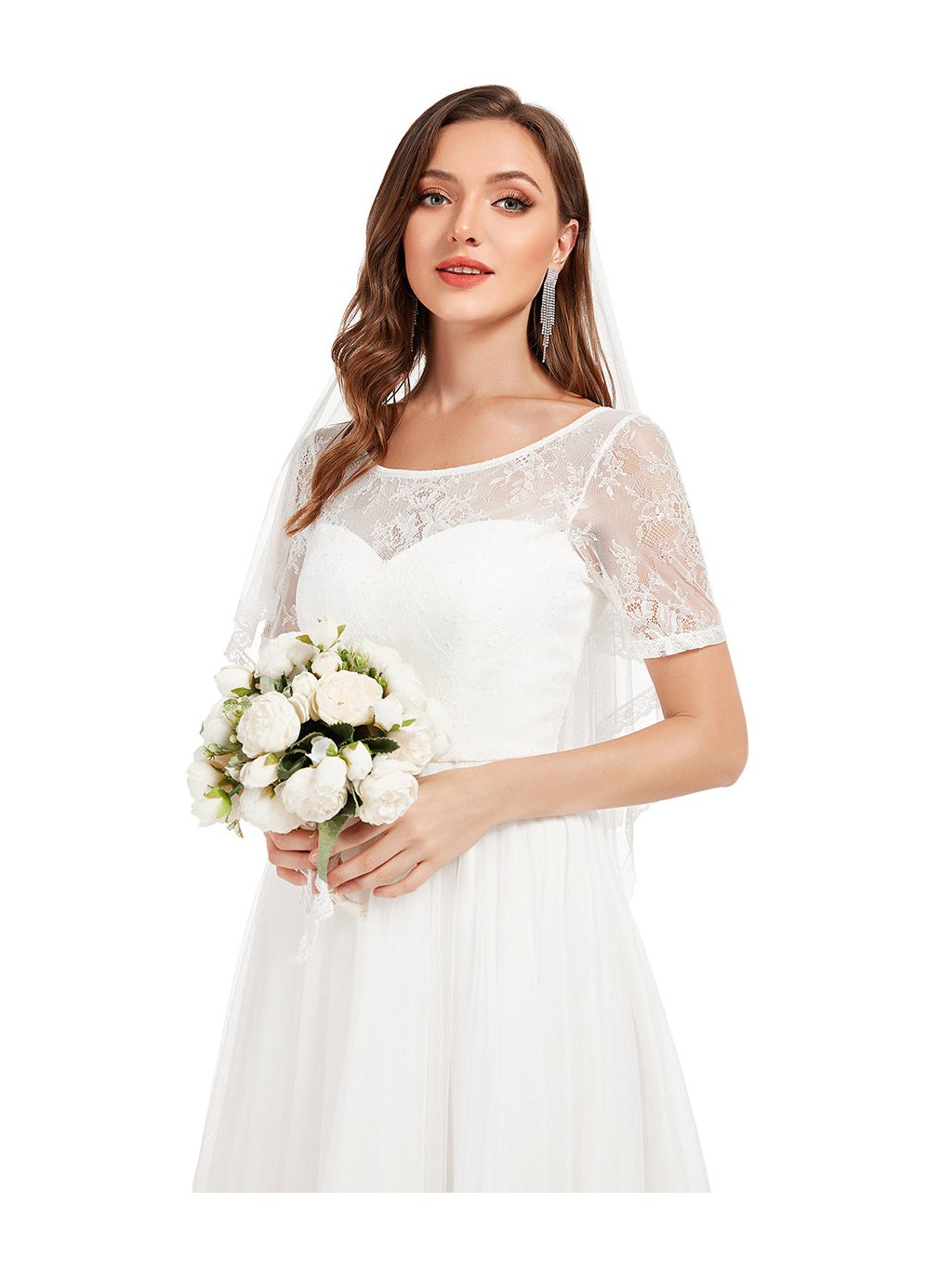Úchvatné svatební šaty Ever Pretty. Šaty mají vrchní díl zdobený krajkou. Mají 3/4 rukávy, na prsou kulatý výstřih a zádech mají hluboký véčkový výstřih a šněrování. Šaty mají velmi bohatší sukni, pro větší objem doporučujeme spodničku.