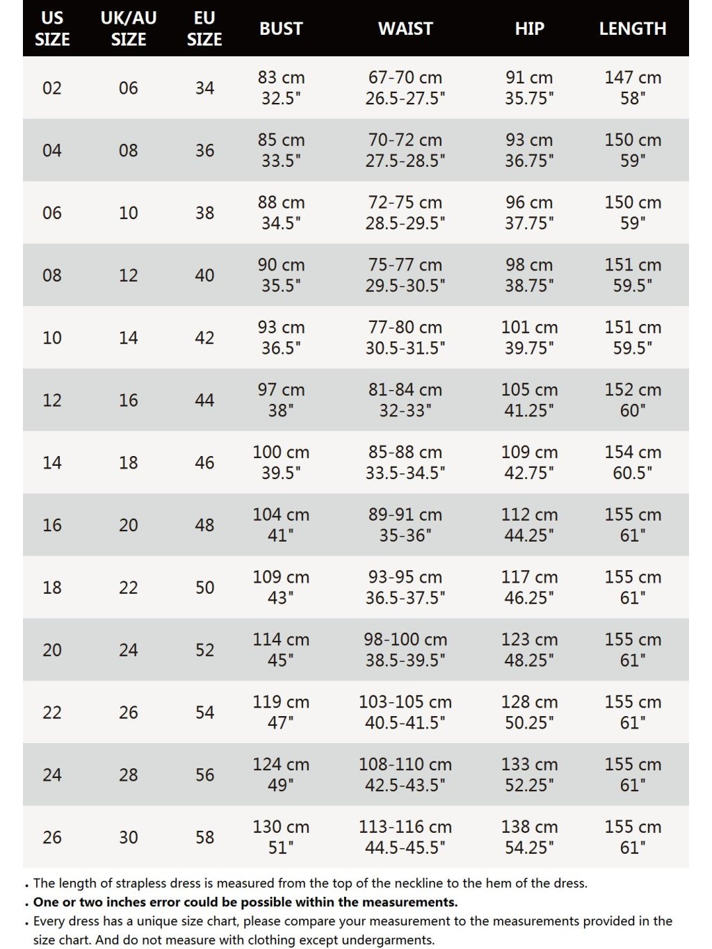 Ever Pretty momentálně rozlišuje dvoje velikosti. V následující tabulce si vyberte správnou velikost. Rozměry jsou měřeny volně, mohou se lišit cca +/- 1cm. Pokud si nejste jistí velikostí, rádi Vám šaty přeměříme či poradíme na chatu či telefonu.