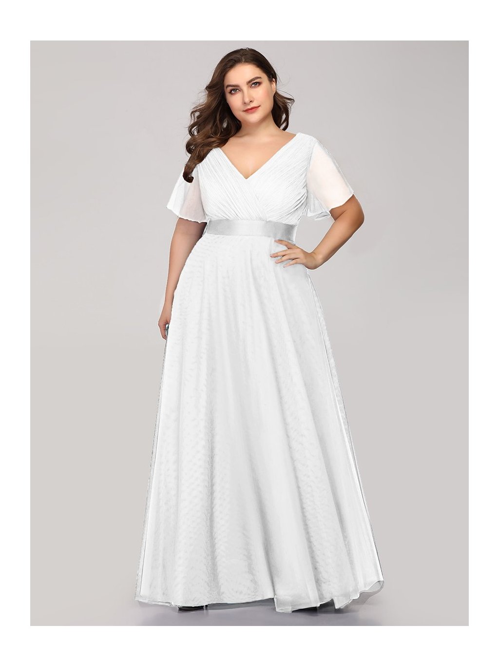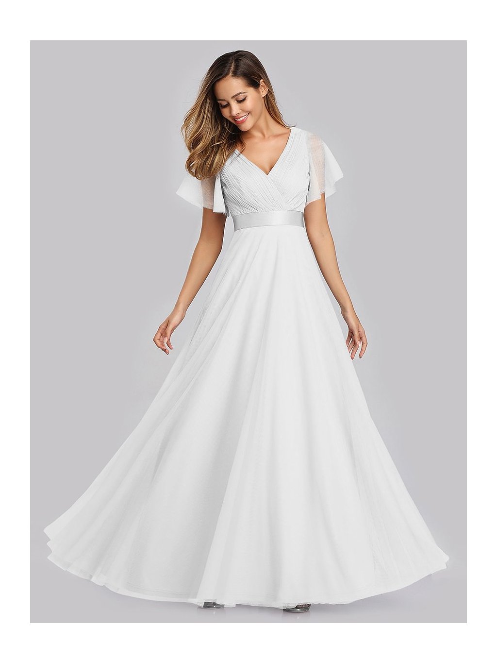 Luxusní dlouhé šaty Ever Pretty. Šaty mají na prsou i zádech hluboký véčkový výstřih. Mají průhledné krátké a volné rukávky. Na zádech mají skrytý zip. Sukně je velmi bohatá je tylová. Šukně je mírně průhledná, pro větší objem a neprůhlednost doporučujeme pod šaty spodničku. Šaty krásně padnou a dělají velmi pěknou postavu.