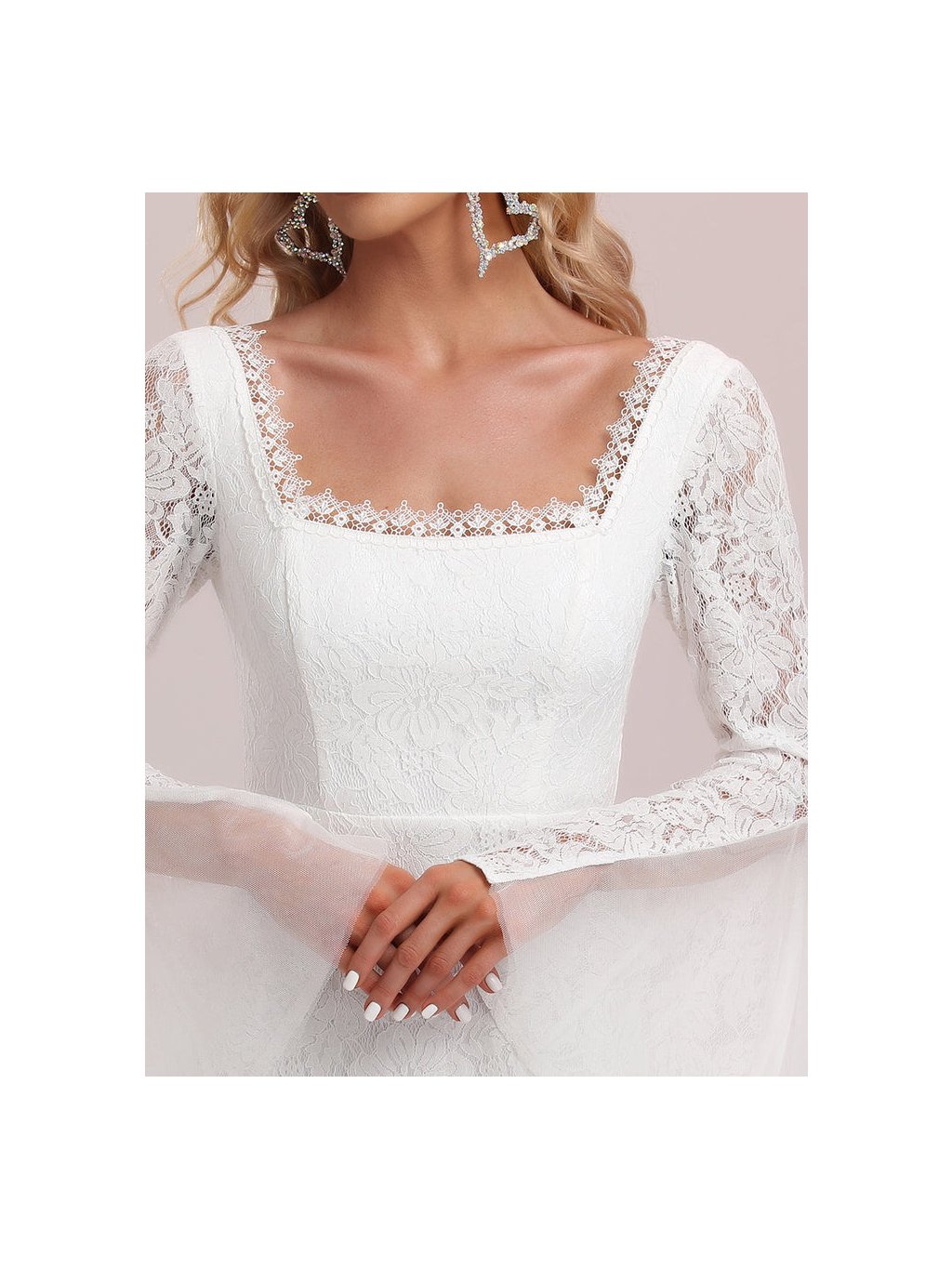 Luxusní krajkové svatební šaty Ever Pretty. Šaty jsou celé krajkové s rozparkem a s dlouhým rukávem. Na prsou mají lodičkový výstřih a na zádech hluboký. Na zádech mají skrytý zip.