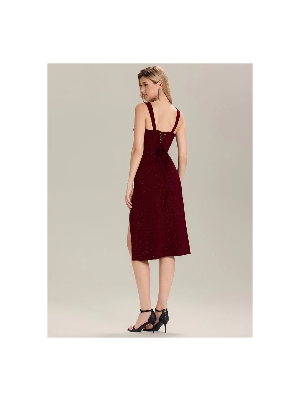 Luxusní bordové šaty Ever Pretty. Šaty mají širší ramínka, Mají zajímavý výstřih na zádech šněrování ,a rozparek a materiál je velice pružný
