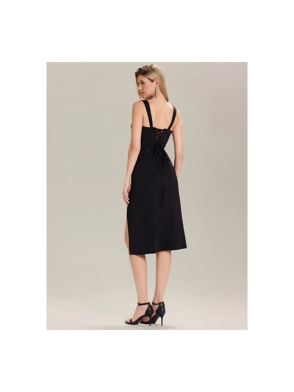 Luxusní černé šaty Ever Pretty. Šaty mají širší ramínka, Mají zajímavý výstřih na zádech šněrování ,a rozparek a materiál je velice pružný