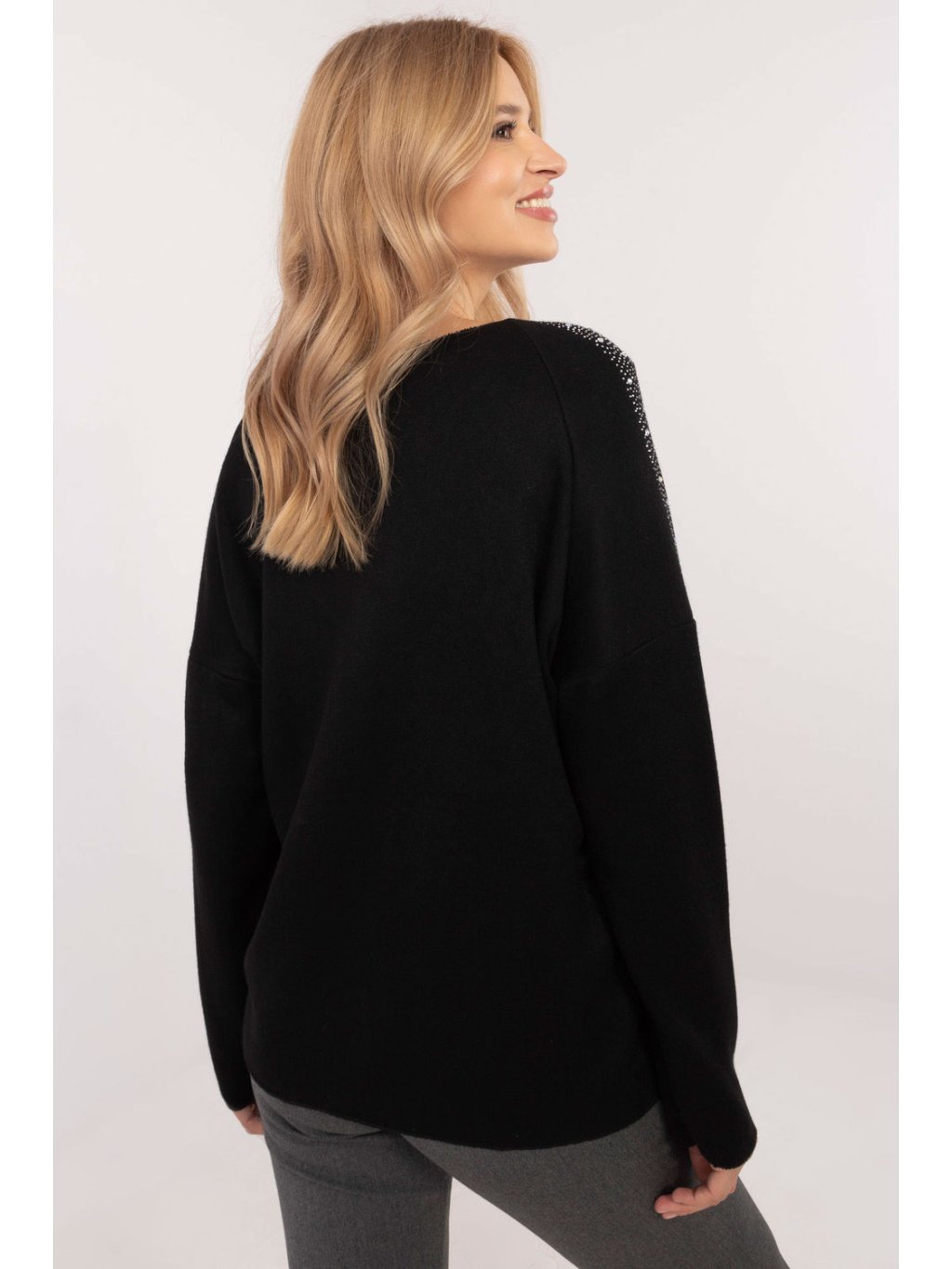 Elegantní dámský svetr ideální jak na speciální příležitosti, tak do každodenního stylu a do práce. Vyrobený z příjemné směsi viskózy a elastanu, poskytuje pohodlí po celý den. Svetr má standardní délku a dlouhý rukáv, co ho činí praktickou volbou na chladnější dny. Dekolt v klasickém, kulatém tvaru dodává jemnosti, a ozdobné džety a třpytivé cirkony na ramenou dodávají celku elegantní, rafinovaný charakter. Tento model se hodí jak do kanceláře, tak na formální setkání.
