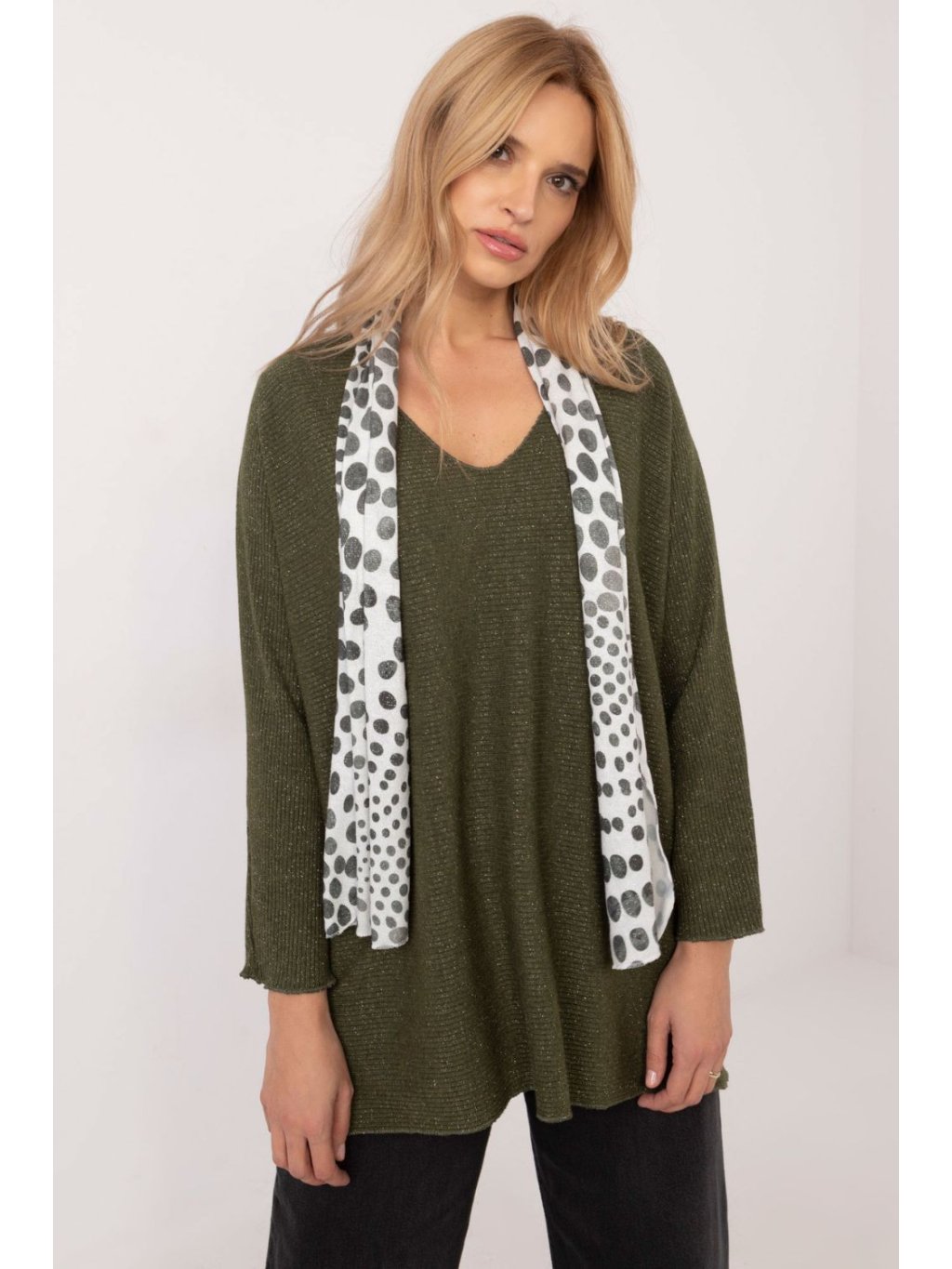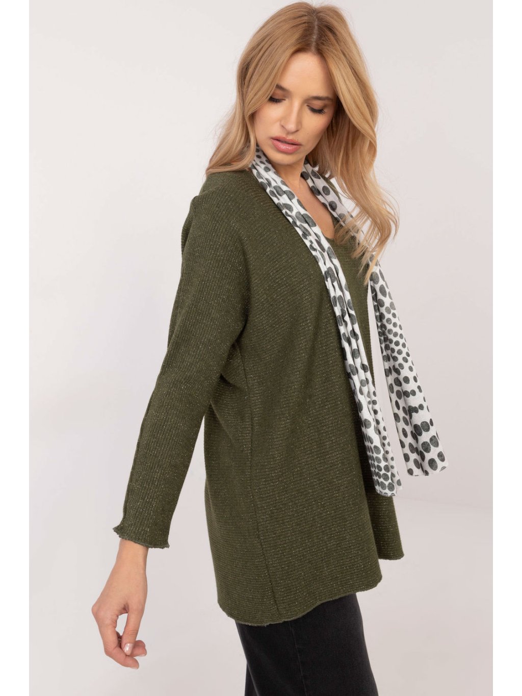 Elegantní dámský svetr s jemnou lesklou nití, který se hodí na každodenní nošení, do práce i na zvláštní příležitosti. Hladký vzor zdůrazňuje univerzálnost svetru, zatímco žebrovaná struktura dodává moderní styl a jemnou strukturu. Svetr je vyroben ze směsi viskózy a elastanu, poskytuje pohodlný střih a mírně přiléhá k postavě. Standardní délka a srdcový výstřih vytvářejí klasický vzhled, zatímco absence zapínání mu dodává ležérní eleganci. Dlouhý rukáv je ideální pro chladnější dny. Součástí balení je šála, která dokonale doplňuje styling.