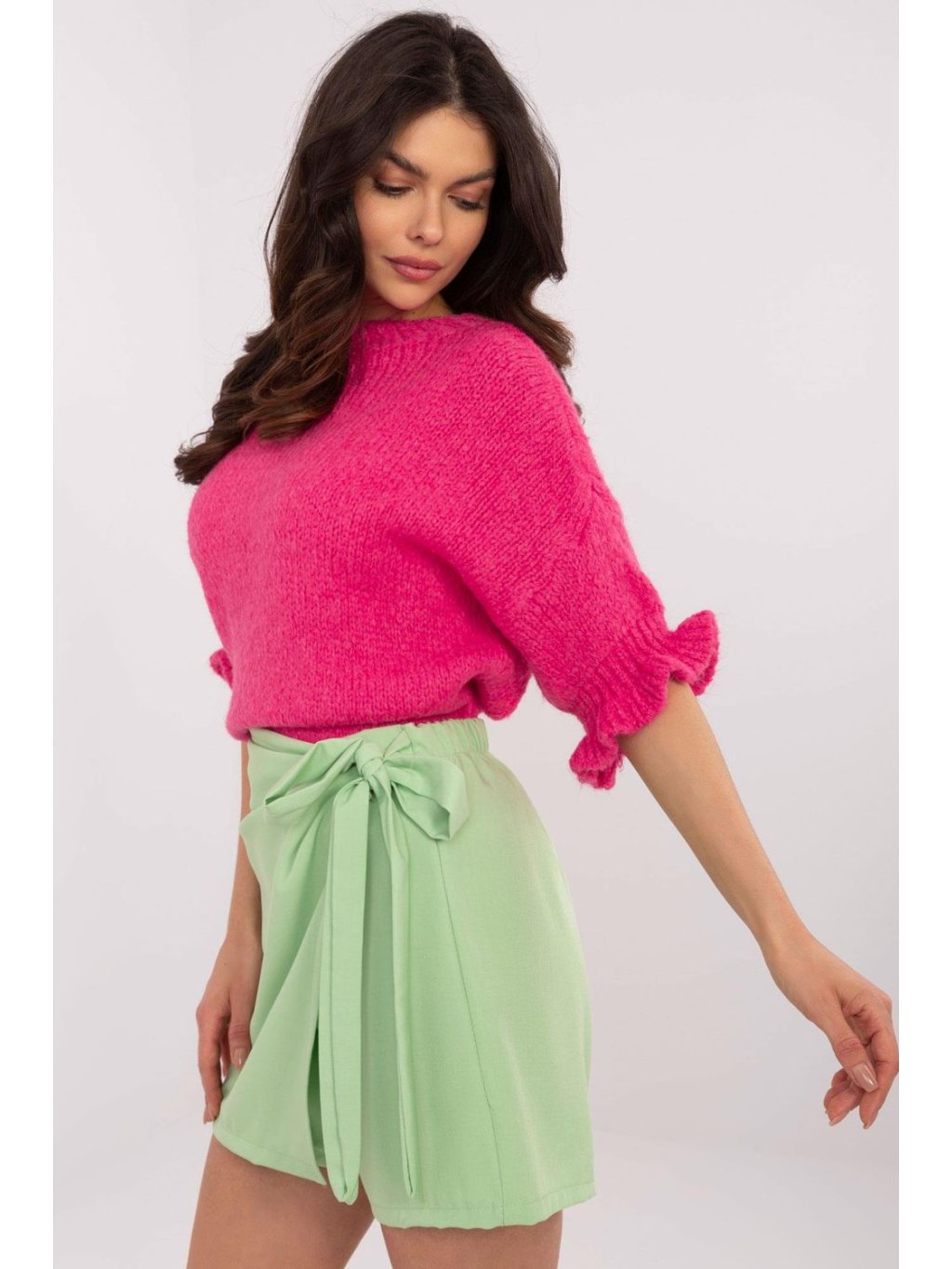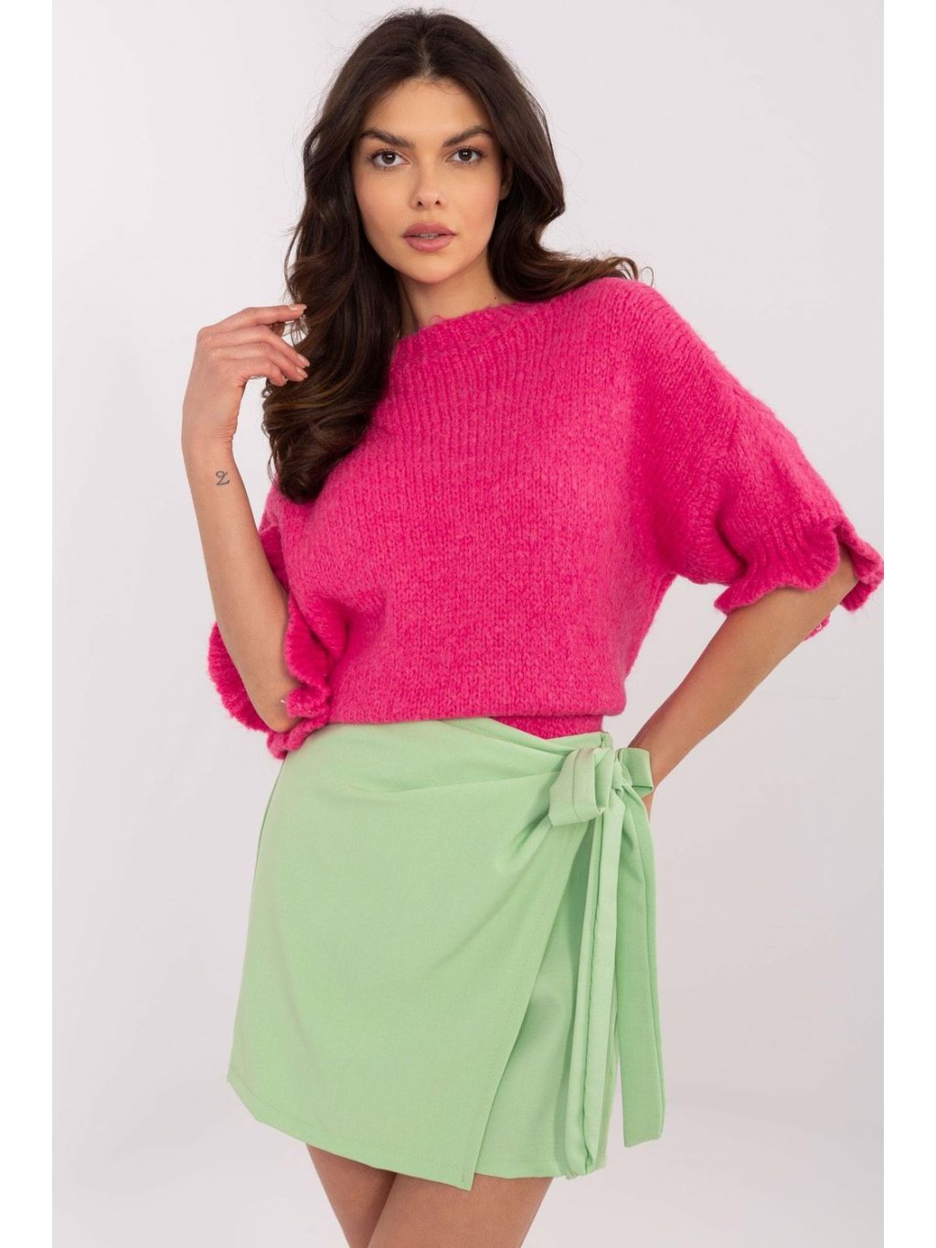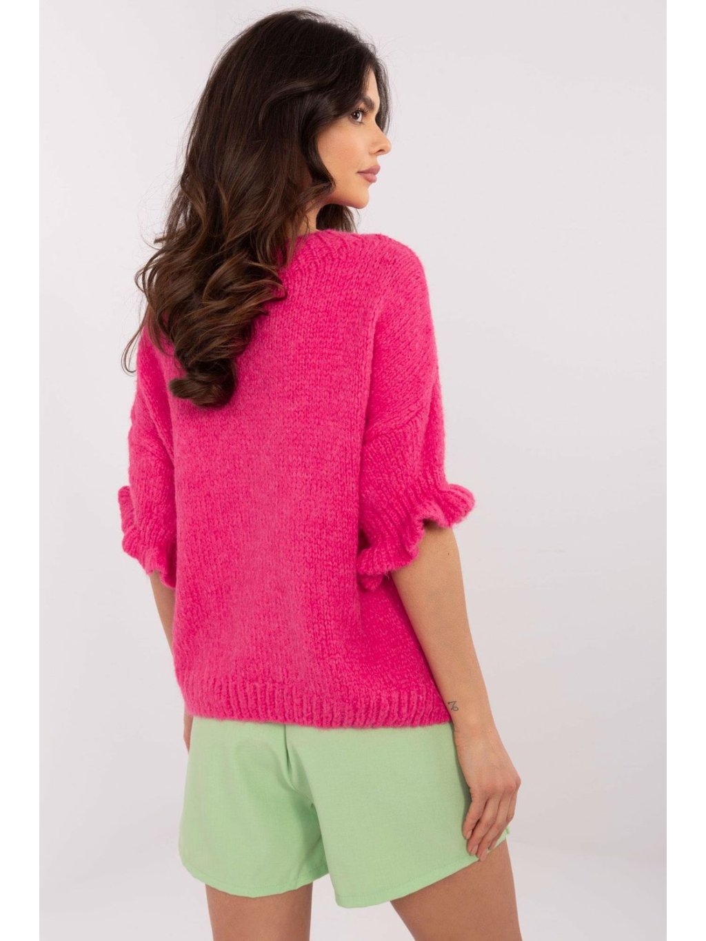 Elegantní dámský svetr s ležérním charakterem je skvělou volbou na každý den i do práce. Vyrobený z měkké směsi akrylu, vlny, polyamidu a viskózy, poskytuje teplo a pohodlí při nošení. Má klasickou standardní délku a elegantní kulatý výstřih, který jemně zdůrazňuje krk. Rukávy délky 3/4 zdobí jemné volány, které dodávají celku ženský šarm. Hladká faktura materiálu dělá svetr univerzálním a snadno kombinovatelným, ideální jak k elegantním kalhotám, tak ke každodenním džínům.