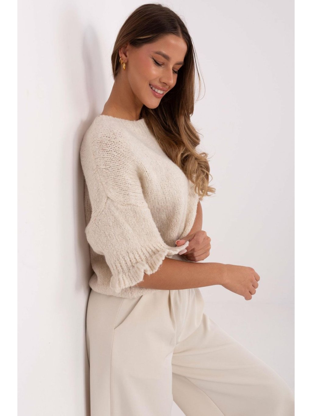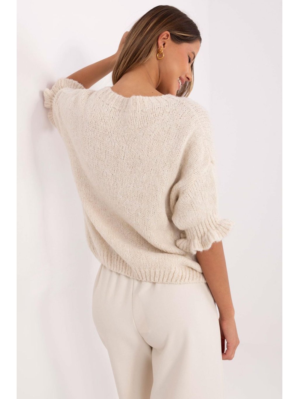 Stylový dámský svetr s casual charakterem je skvělou volbou na každý den i do práce. Vyrobený z měkké směsi akrylu, vlny, polyamidu a viskózy poskytuje teplo a pohodlí nošení. Má klasickou standardní délku a elegantní kulatý výstřih, který jemně zdůrazňuje krk. 3/4 rukávy jsou ozdobené decentními volány, které dodávají celku ženský šarm. Hladká struktura materiálu činí svetr univerzálním a snadným na stylování, ideální jak k elegantním kalhotám, tak k běžným džínům.