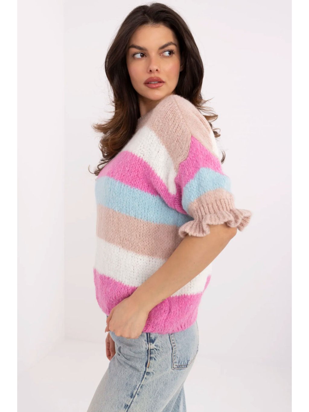 Svetr s pruhy pro dámy je klasickou volbou, která se skvěle hodí na každý den, do práce a do casual stylizací. Vyrobený z měkké směsi akrylu, viskózy, vlny a polyamidu poskytuje pohodlí a příjemné teplo. Model s standardní délkou a rukávy 3/4 a kulatým výstřihem je ideální volbou na chladnější dny. Dalším akcentem je decentní volánka na rukávech, která celku dodává ženský charakter. Bez zapínání je svetr snadný na oblékání a pohodlný na nošení, a pruhy mu dodávají módní vzhled, který lze snadno sladit s různými stylizacemi.