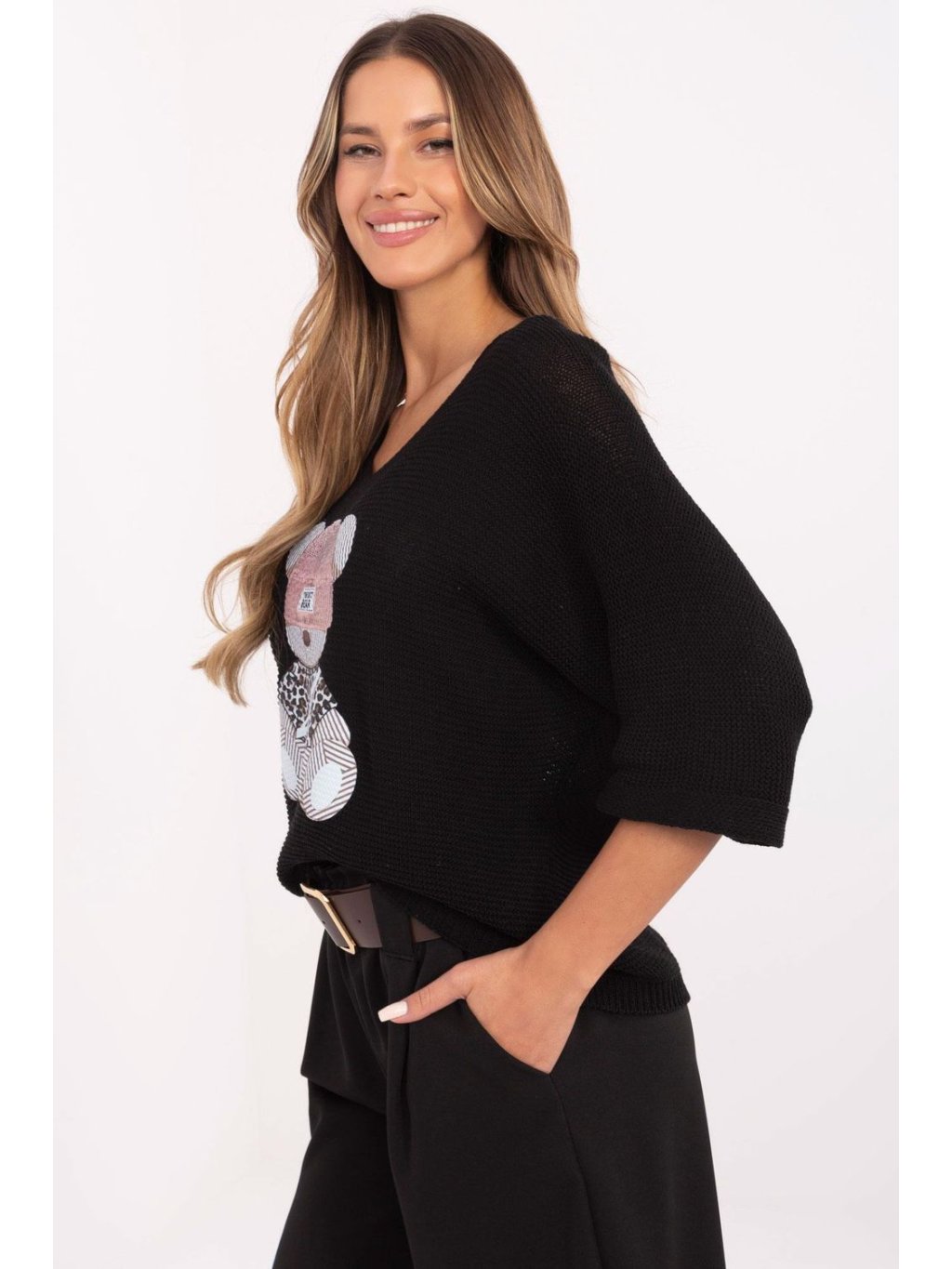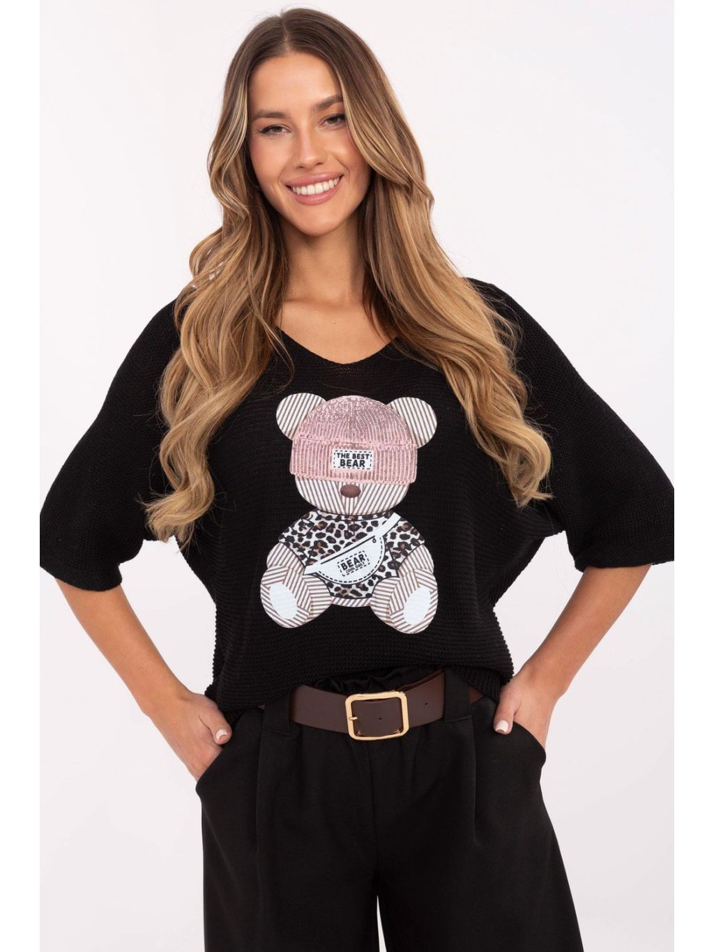 Casuální dámský svetr ideální na každý den i do práce. Vyrobený z vysoké kvality směsi bavlny a akrylu, poskytuje pohodlí a odolnost. Standardní délka svetru se skvěle hodí jak k džínům, tak k elegantním kalhotám. Svetr je zdoben roztomilým potiskem medvídka vpředu, dodávajícím mu výjimečný charakter. 3/4 rukávy a výstřih do V dodávají celku ženský a stylový vzhled. Skvělá volba pro ženy, které ocení pohodlí a módní design.