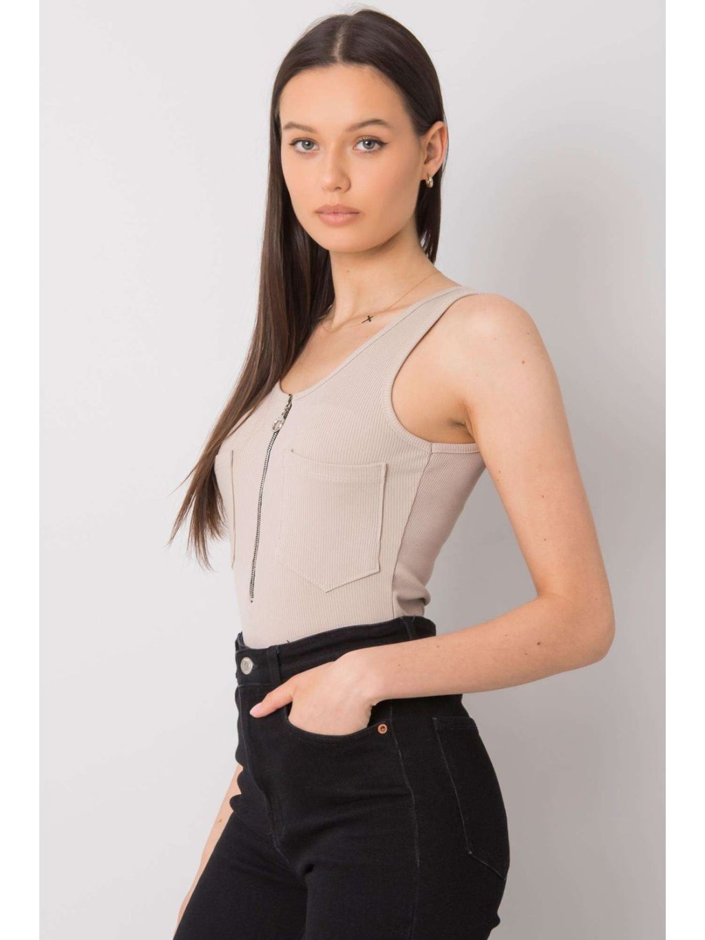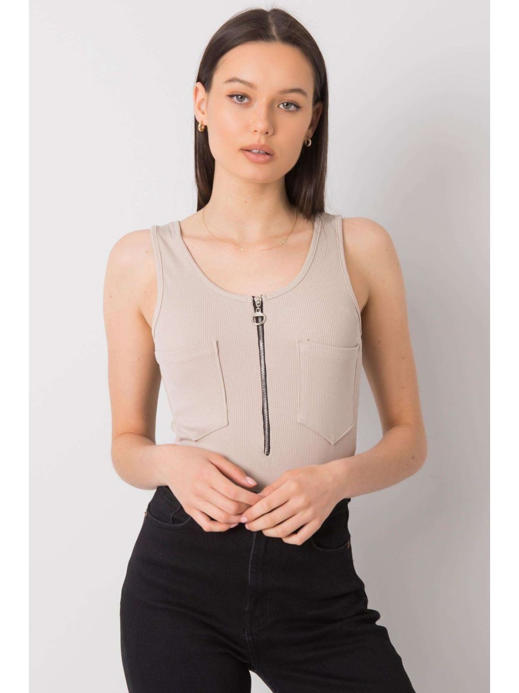 Tričko s kulatým výstřihem, ramínka. Zapínání na zip vpředu a ozdobné kapsy. Ideální na léto.