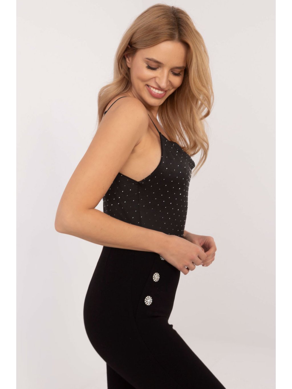 Elegantní top s nastavitelnými ramínky, který upoutá pozornost jemnými kamínky po celé látce. Je vyroben z vysoce kvalitní kombinace polyesteru a viskózy a poskytuje pohodlí a odolnost. Standardní délka a kulatý výstřih mu dodávají univerzální charakter, který se uplatní jak při každodenních stylizacích, tak při elegantnějších příležitostech. Top se skvěle kombinuje s ostatními kousky ve vašem šatníku a jeho lesklá struktura s kamínky vnese do vašeho vzhledu nádech sofistikovaného půvabu.