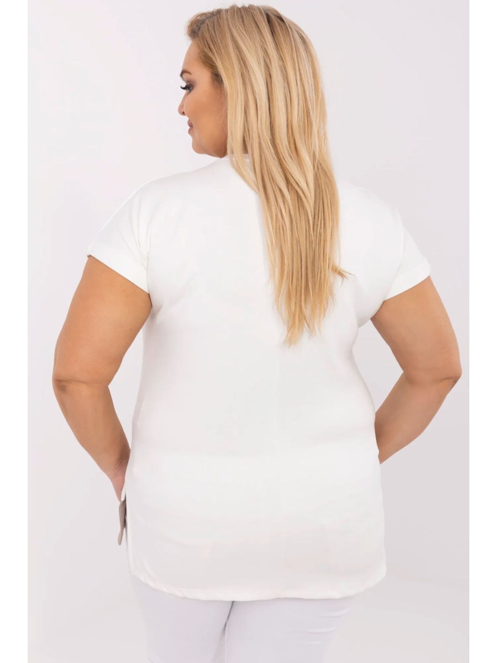 Tento každodenní plus size tričko je skvělou kombinací pohodlí a ležérního stylu. Vyrobeno z mimořádně měkkého a příjemného materiálu, který se příjemně dotýká těla (viskóza s příměsí elastanu a polyesteru), skvěle se přizpůsobuje tělu a poskytuje pohodlí po celý den. Hladká struktura a klasický, kulatý výstřih dělají tento model vhodným pro mnoho stylizací, standardní délka a krátký rukáv ho činí praktickou volbou na každý den. Kontrastní vložka dole vpředu přidává tričku moderní akcent a opticky zeštíhluje postavu. Bez zapínání, snadné oblékání a nošení.