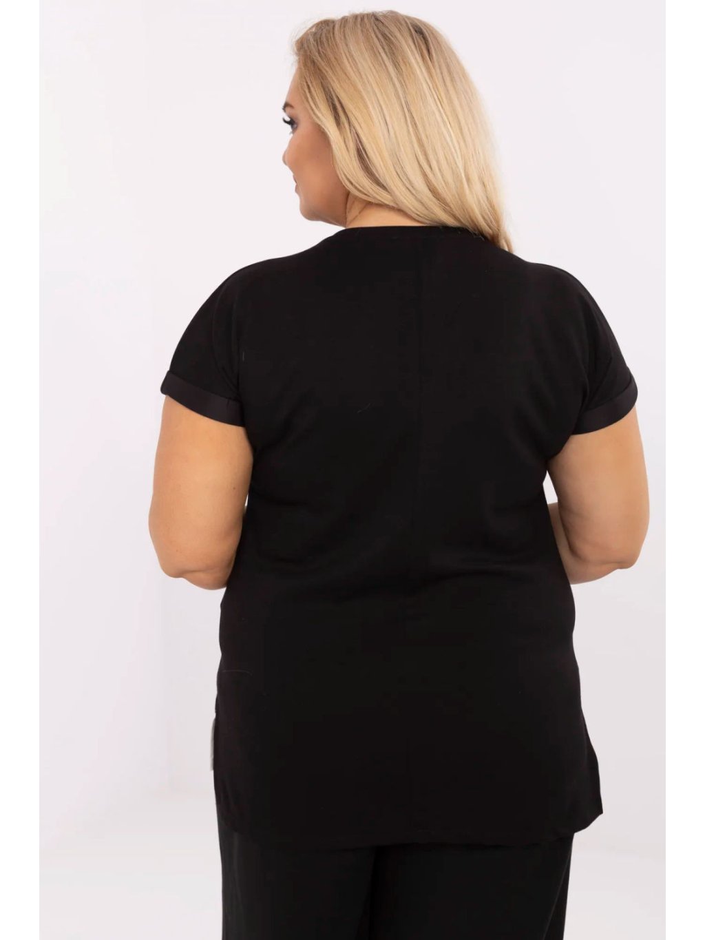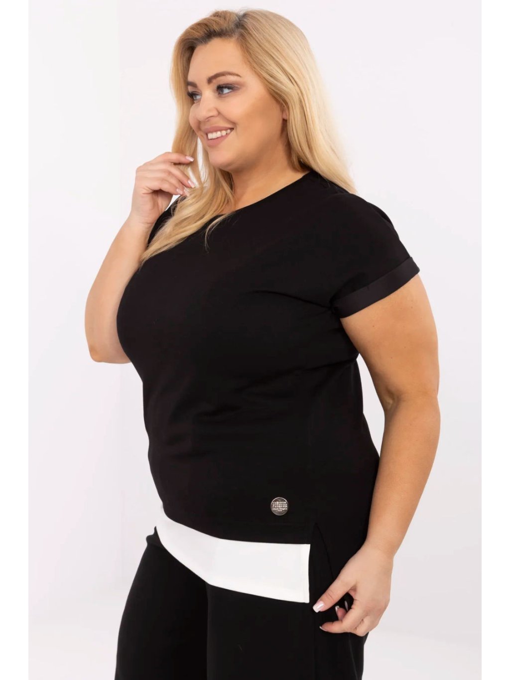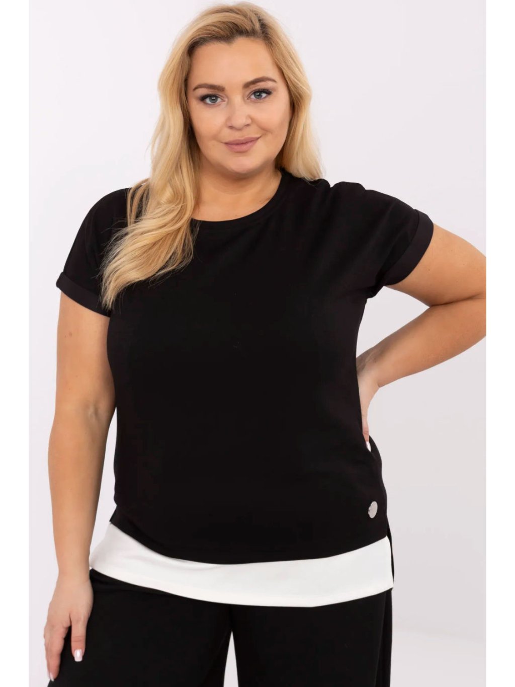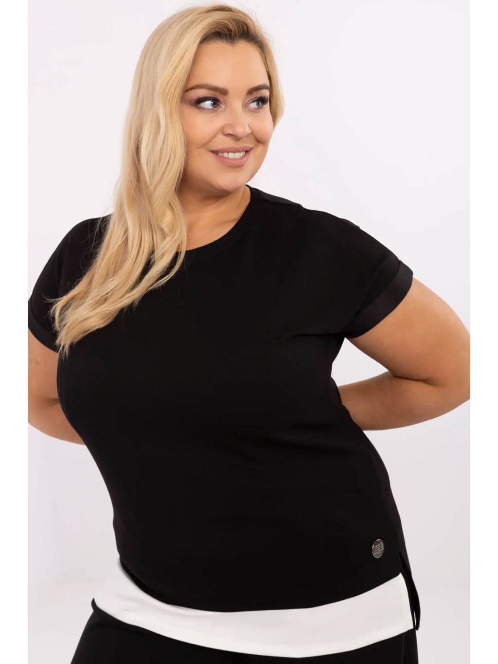 Tento každodenní top plus size je skvělou kombinací pohodlí a ležérního stylu. Vyrobený z velmi měkkého a příjemného materiálu typu "máslo" (viskóza s příměsí elastanu a polyesteru), skvěle padne a poskytuje pohodlí po celý den. Hladká struktura a klasický kulatý výstřih dělají z modelu skvělý doplněk k mnoha stylizacím, standardní délka a krátký rukáv z něj dělají praktickou volbu na každý den. Kontrastní vložka ve spodní části přední části topu přidává moderní dotek a opticky zúžuje postavu. Bez zapínání, snadné na oblékání a nošení.